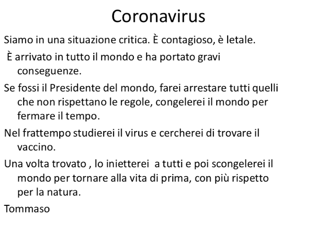Infatti il Corona virus è una cosa grave e non c’è niente da scherzare! Anche se dobbiamo stare in casa per alcuni giorni, lo facciamo per noi tutti, per i nostri parenti, per la nostra famiglia, per non metterci tutti in pericolo: è meglio stare a casa per proteggerci. Ma niente paura: noi insieme lo sconfiggeremo!
